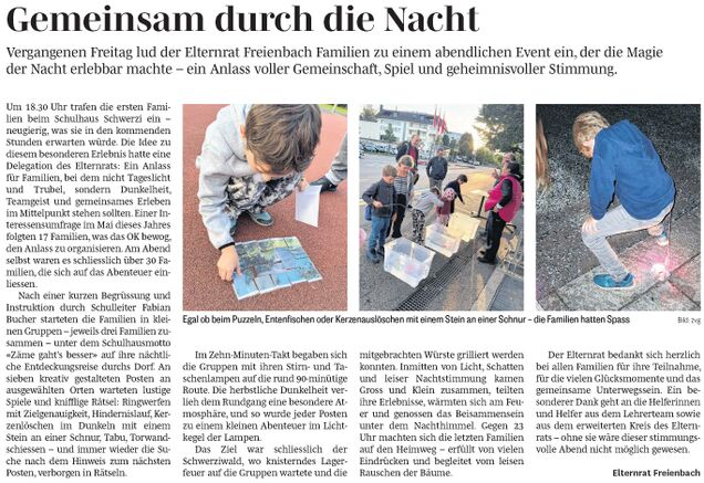 Am Freitag, 5. September 2025, lud der Elternrat Freienbach Familien zu einem abendlichen Event ein, der die Magie der Nacht erlebbar machte – ein Anlass voller Gemeinschaft, Spiel und geheimnisvoller Stimmung.